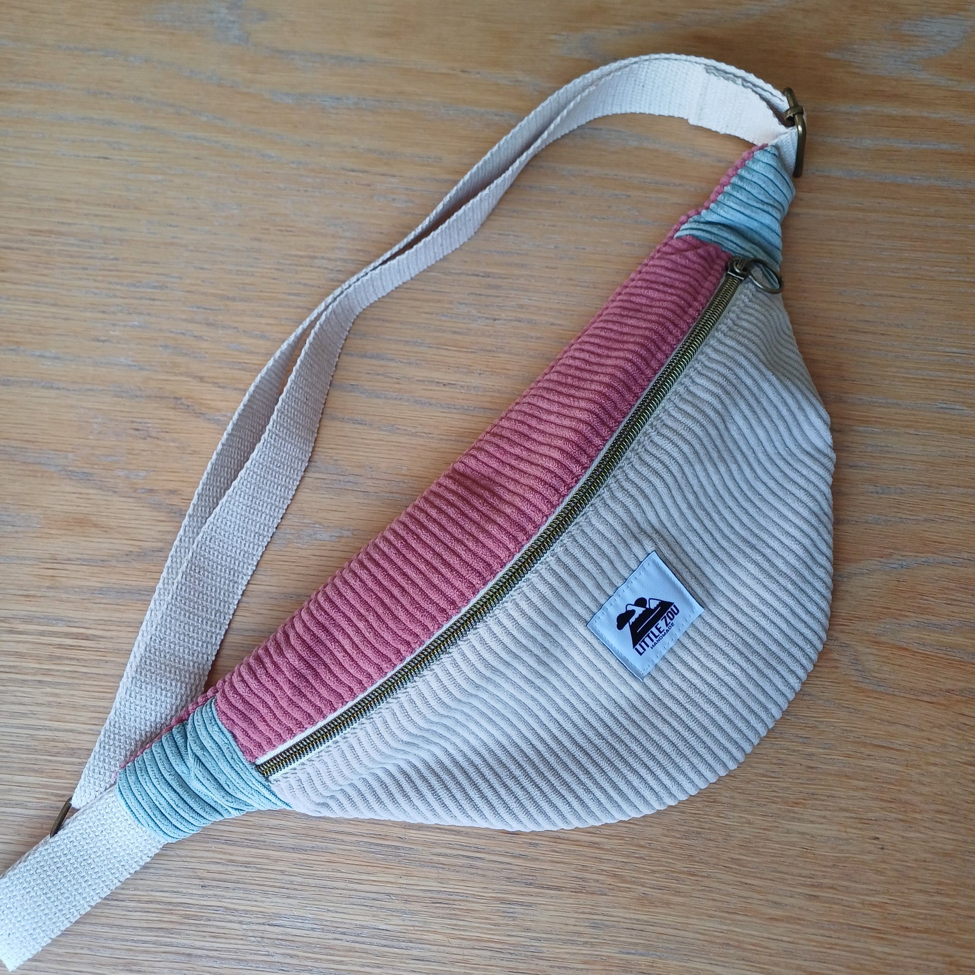 Sac banane en tissu velours avec bandoulière réglable et deux poches intérieures.